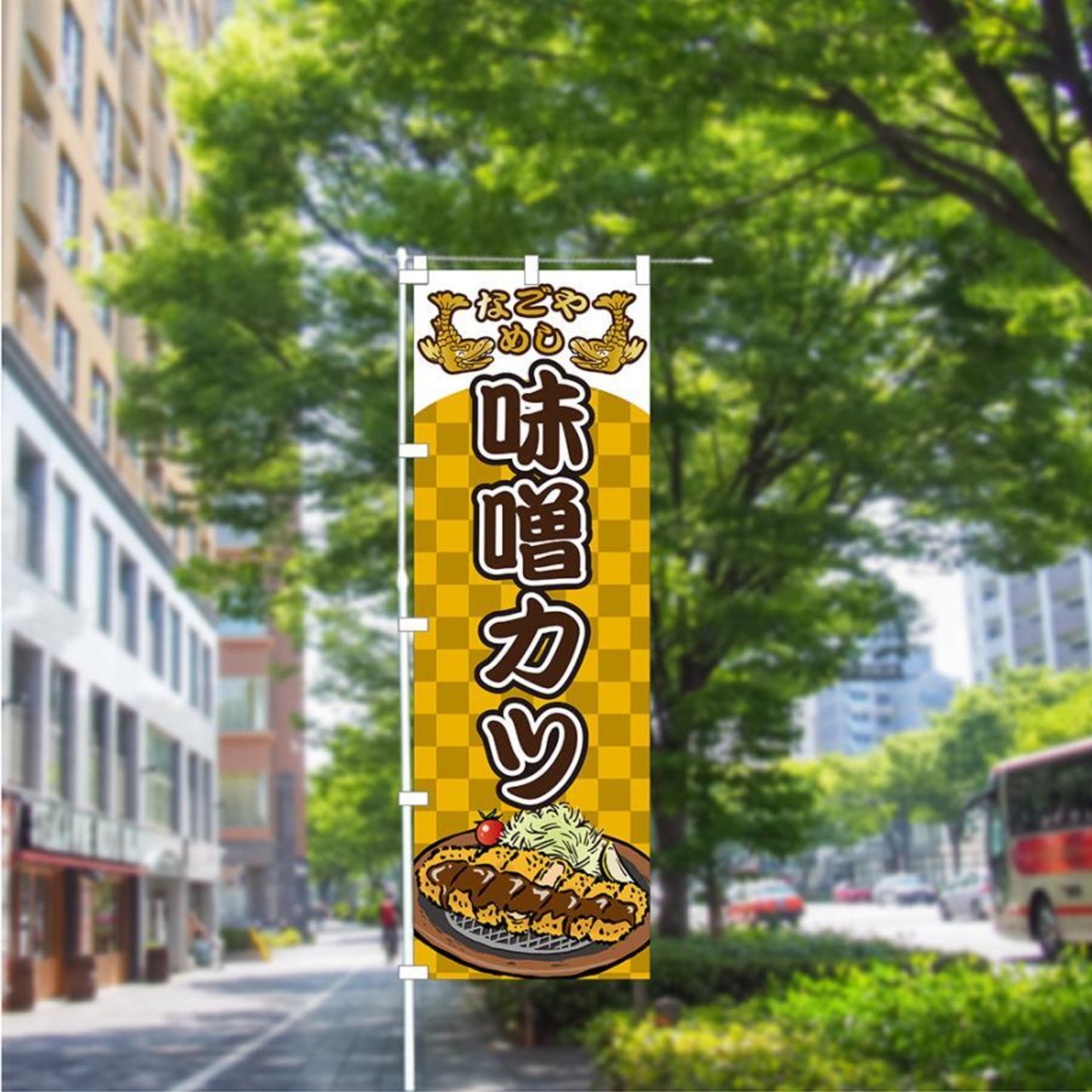 関連キーワード:のぼり 旗 味噌カツ みそかつ 名古屋 なごやめし 名物 旨い おいしい こだわり ご当地 人気 イラスト シャチホコ 目立つ 600*1800